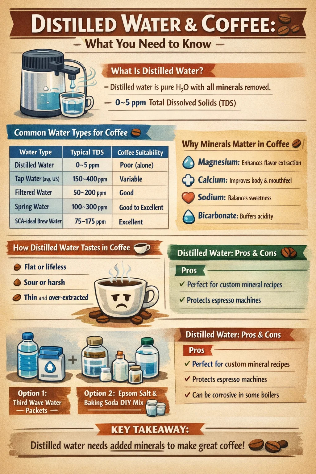 Specialitas Coffee Consociationis (SCA) signa aquae qualitates medicandae edit: scopo TDS of 150 ppm, acceptabile range 75-250 ppm , cum scopum duritiei carbonatis calcii 50-175 ppm. Aqua destillata ad 0-5 ppm longe extra fenestram illam sedet — non est instrumentum pro modulo capulus medicandi.