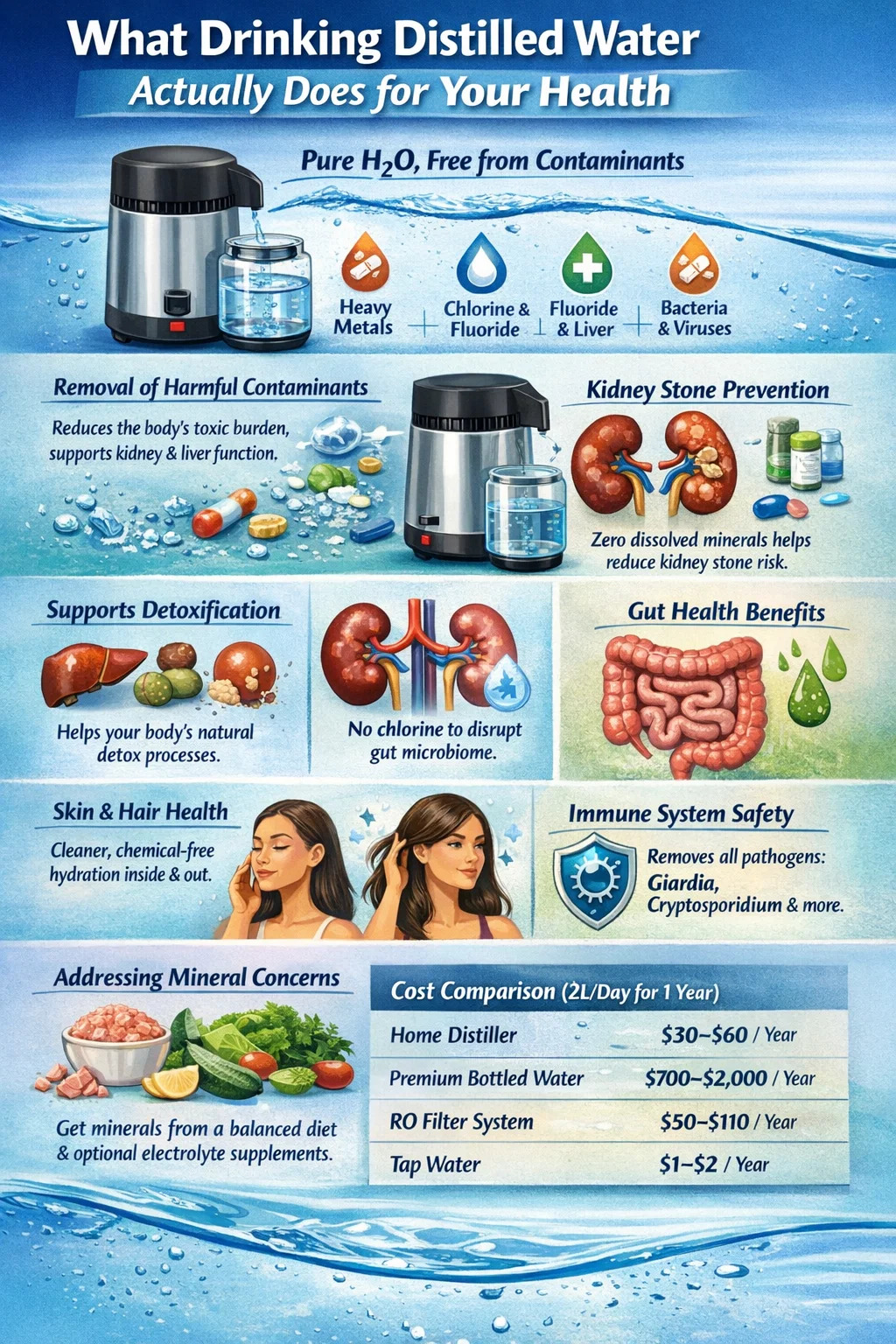 Aqua decocta non cuiuslibet condicionis remedium est, sed assiduum et humilem fontem chemicae nuditatis e vita cotidiana removet. Pro certis hominibus sanitatis curas — lapides renes, immunitatem suspecti, chemicae sensus, ventris sanitatis quaestiones, vel de gravibus metallis nuditate — causa pro domo aquae Distiller praecipue fortis est.