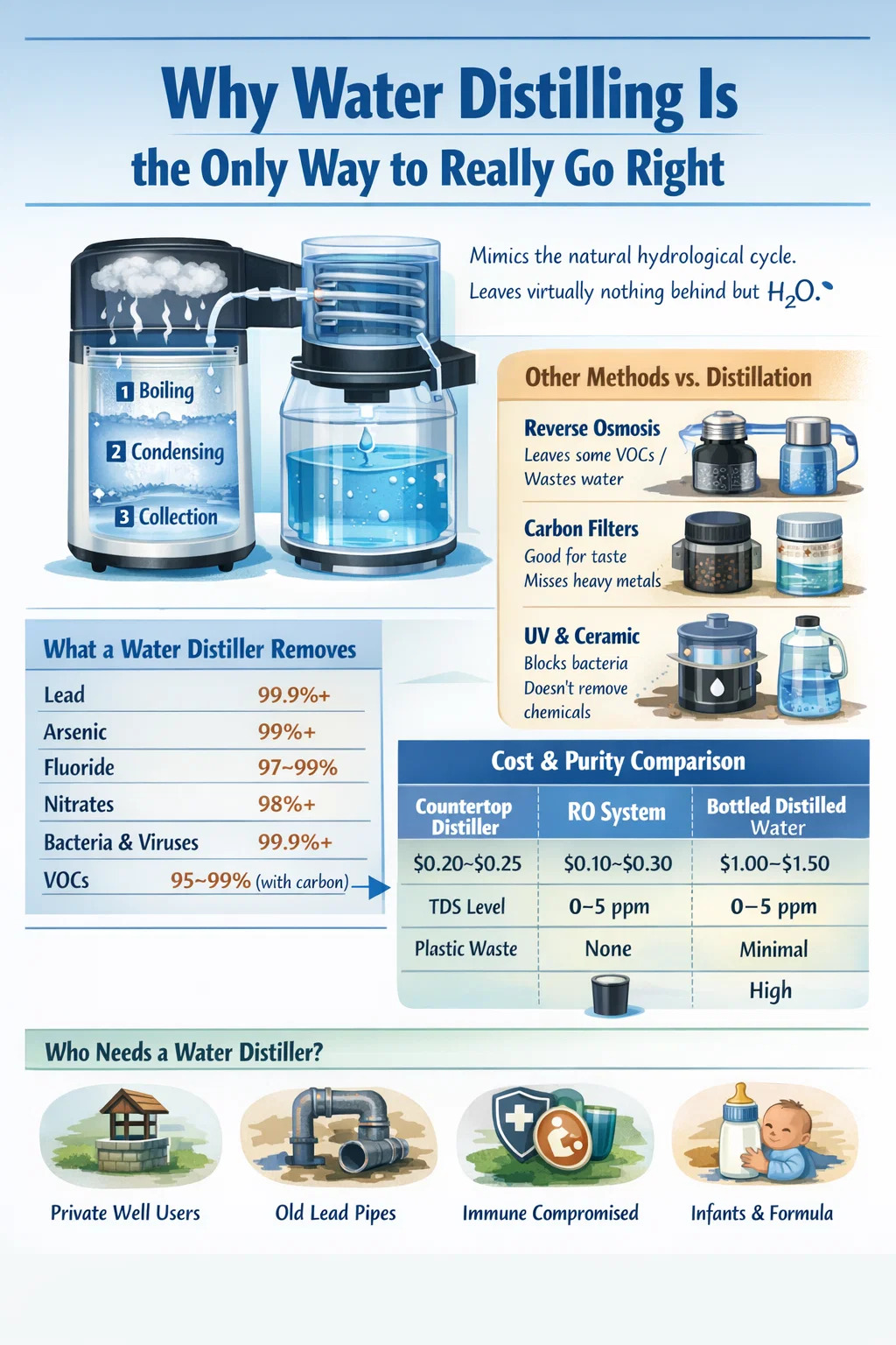 Si ullum tempus aquae purificationis investigandi expenderis, probabiliter invenisti columellas osmosos vicissim, caudices carbonii, UV sterilitates, et columellas ceramicos. Omnes aquam mundam promittunt. Quidam ex eis faciunt officium honestum ad tollendum certos contaminantes. Sed nullus eorum appropinquat ad id quod aqua distillans facit. Cum aquam distillationis dicunt homines solum esse viam ut vere recta eant, non sunt dramatica. Processum physicum describunt, qui cyclum hydrologicum imitantem et fere nihil relinquit praeter H₂O moleculas.