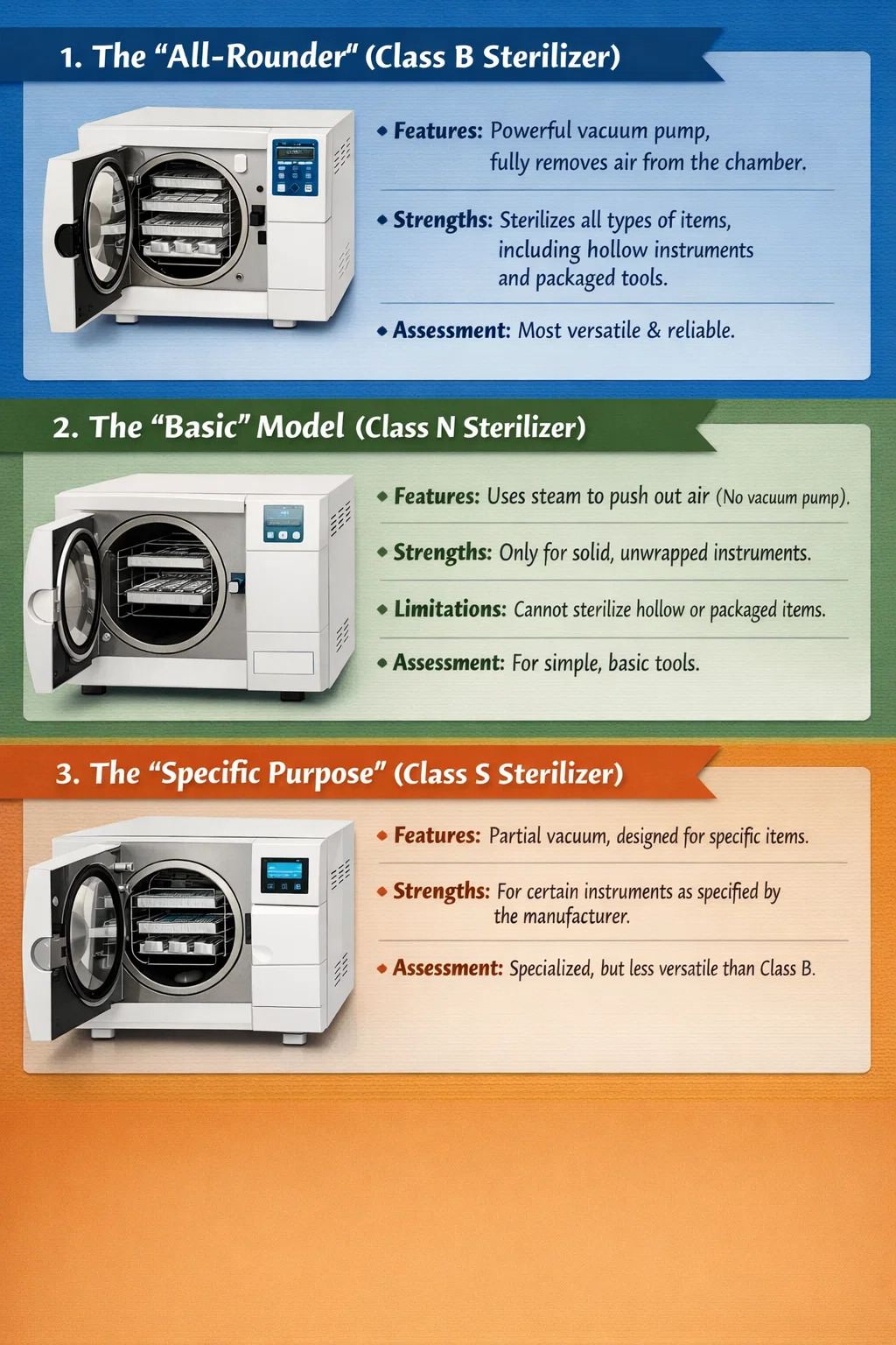 Etsi sterilizatio armorum usus in clinicis dentalibus similes videri potest, haec dentalis autoclaves typice dividuntur in tria genera principalia secundum quam aerem tractant et facultates suas.