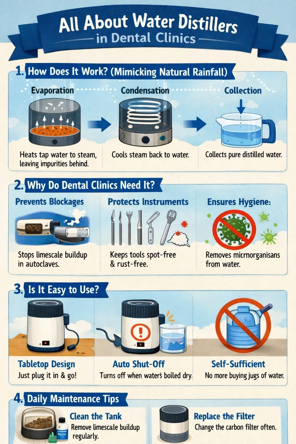A aqua distiller essentialiter parva officina dedicata ad producendum "aqua pura". In clinicis dentalibus, autoclavibus dentalibus dentalis particeps esse solet, quia autoclaves valde "picky" circa aquam utuntur et solum hac aqua destillata munda uti possunt.