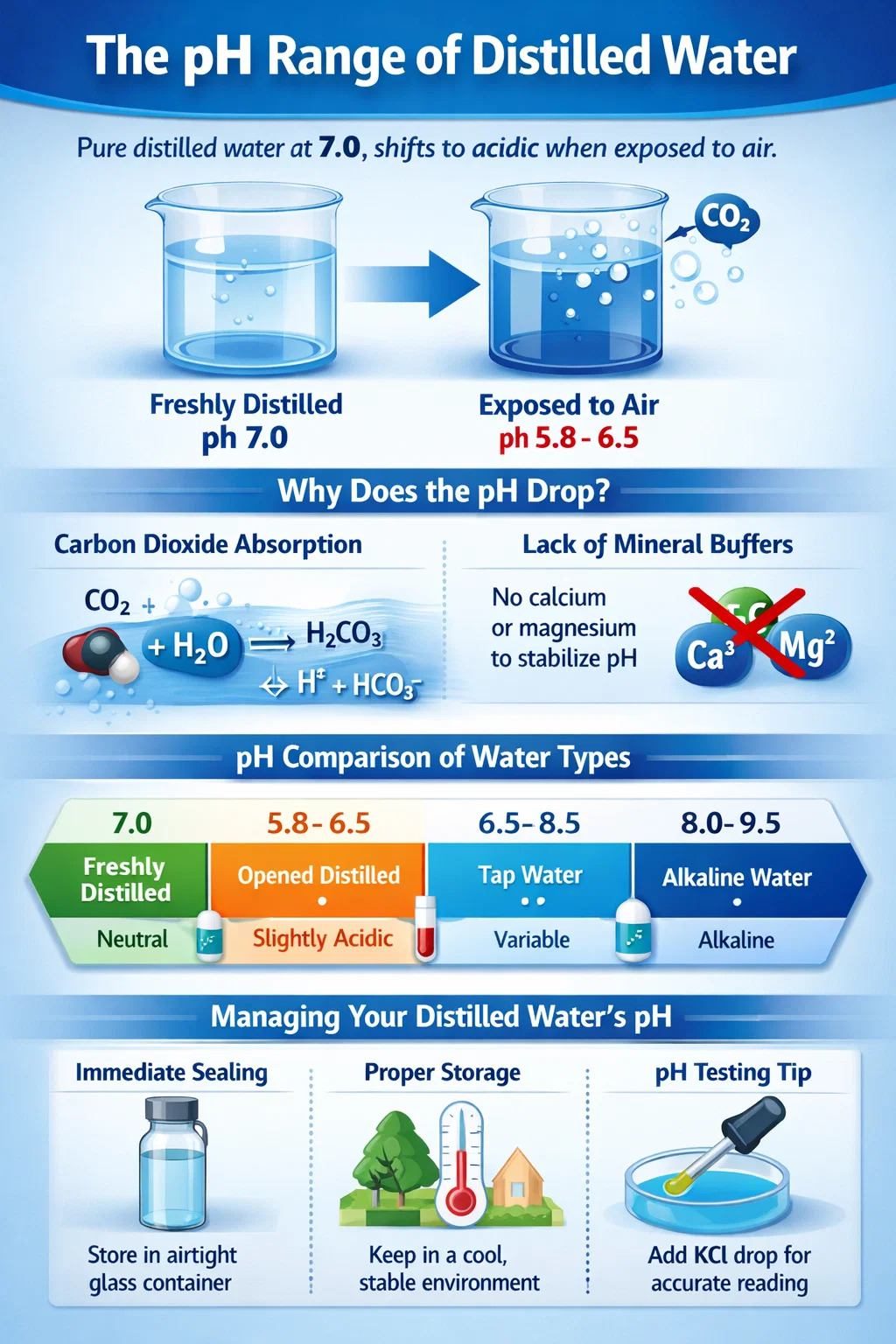 Secus sonum aquae, quae calcium et magnesium continet, qui agit ut buffers naturales ad pH firmum custodiendum, aqua destillata nullam habet facultatem buffering. Quocirca etiam tantulum gasi absorptum facit significant adductius in pH * . Quam ob rem probatio aquae decoctae cum norma pH habena potest interdum cedere eventus frustrating inconstantes.