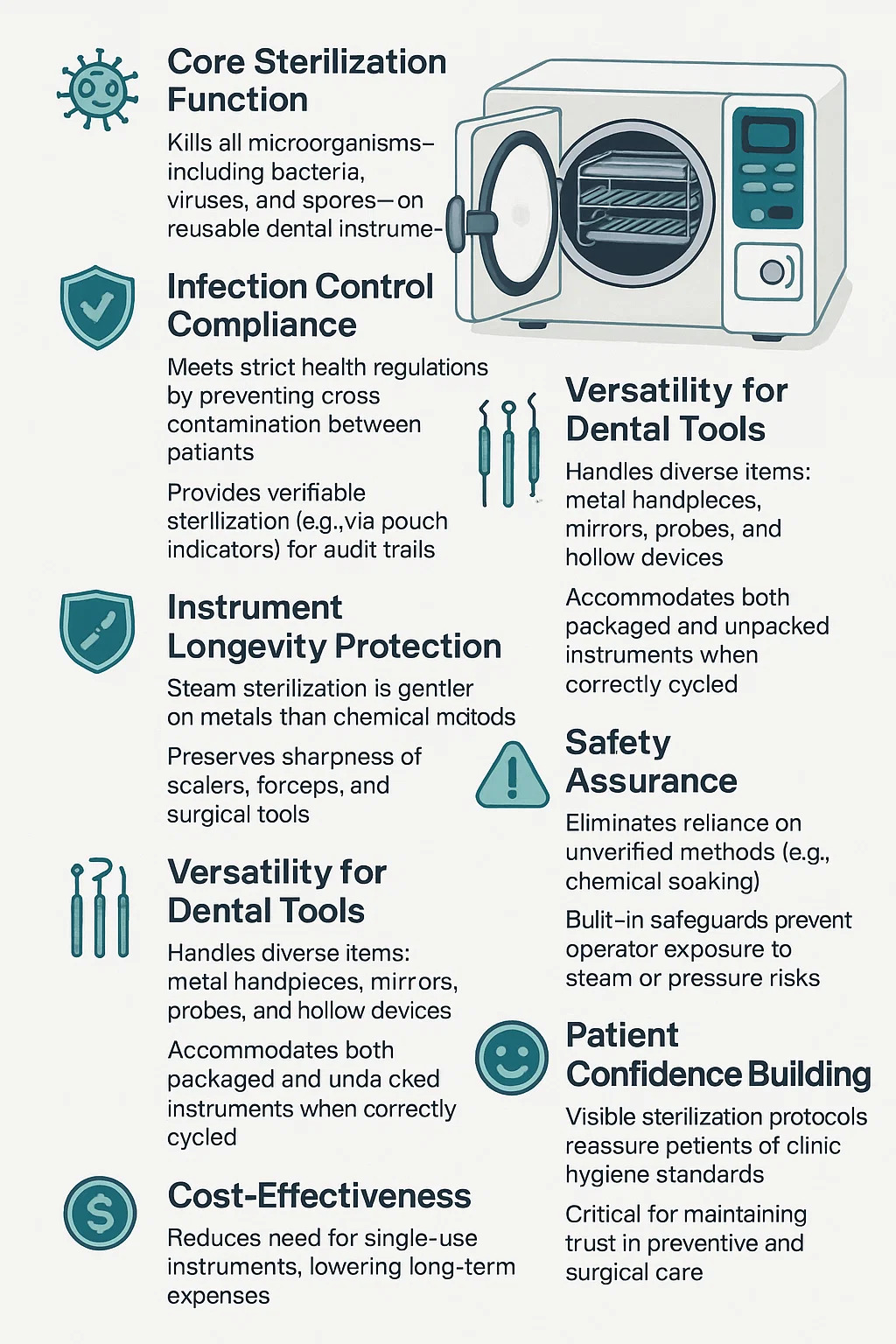 | Sterilitatem Instrumentorum | Perimit omnia bacteria, virus & sporis | Ensures instrumenta biologicam reuse tuta sunt |